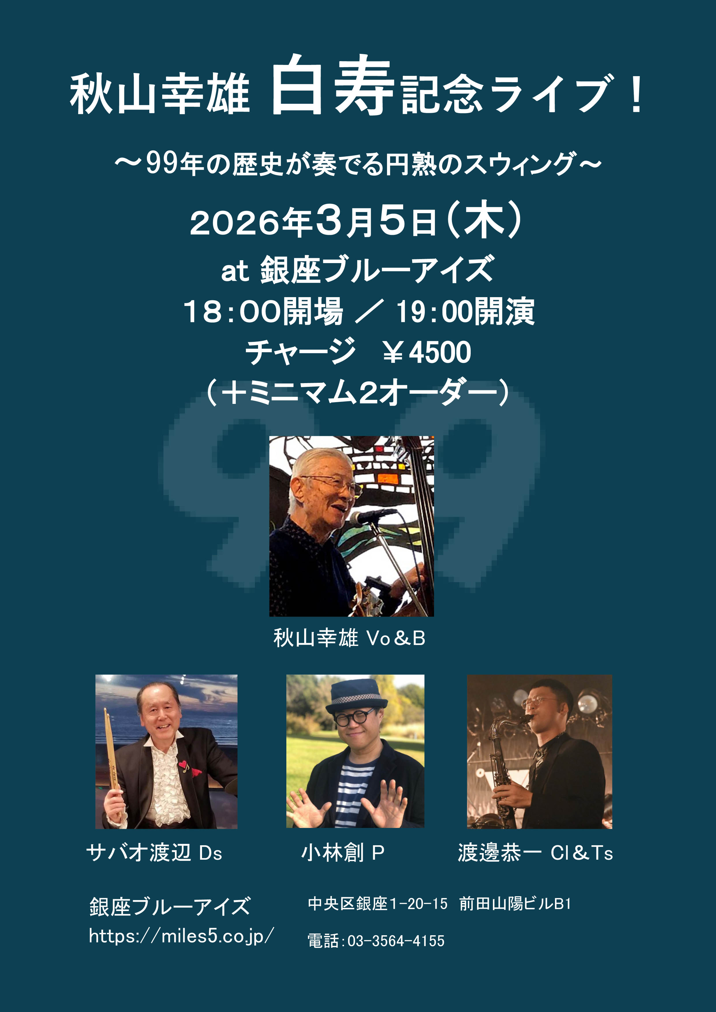 | 5 | 木 | 銀座ブルーアイズ 秋山幸雄 白寿記念ライブ! |